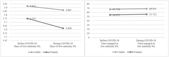 Changes in low-intensity PA by gender before and during COVID-19. Note: Time represents the number of minutes exercised per week.
