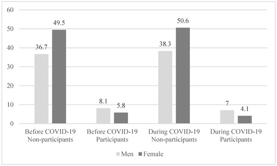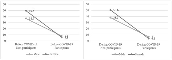Figure 5 shows the results of a chi-square test to compare regular PA by gender before and during COVID-19. While women had more regular PA non-participants than men before COVID-19, men had a higher number of regular PA participants than women. During COVID-19, similar trends appeared as before COVID-19 (p < 0.001). Comparing the periods before and during COVID-19, the number of regular PA particpants decreased from 18,436 (8.1%) to 16,124 (7.0%) for men and from 13,207 (5.8%) to 9382 (4.1%) for women. As a result, overall regular PA participants decreased on average from 31,643 (13.8%) to 25,506 (11.1%).
