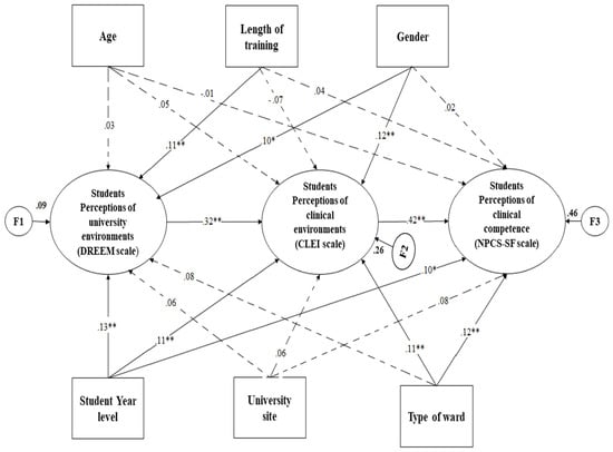 The tentatively hypothesized model predicting nursing students’ perceptions of professional competence, university environment, and clinical environment. Dotted lines show statistically insignificant paths. All estimates are standardized B coefficients. ** p < 0.001, * p < 0.05.