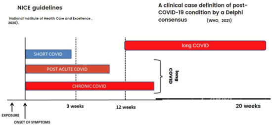 As shown in Figure 1, the NICE guidelines (2020) state that ‘long COVID’ is commonly used to describe signs and symptoms that continue or develop after acute COVID-19. It includes both ongoing symptomatic COVID-19 (from 4–12 weeks) and post-COVID-19 syndrome (12 weeks or more) [11]. The WHO’s definition states, “Post COVID-19 condition occurs in individuals with a history of probable or confirmed SARS-CoV-2 infection, usually 3 months from the onset of COVID-19, with symptoms lasting for at least 2 months that cannot be explained by an alternative diagnosis” [9].