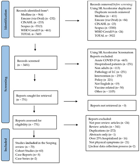 From the database searches on long COVID, 7403 studies in total were identified (Figure 2). A total of 751 studies were available for full-text review following the removal of duplicates and exclusion of records based on title and abstract screening. A total of 679 studies were further excluded as they were not original research (review studies) and/or not peer reviewed. Further excluded studies were those where more than 25% of the participants were hospitalised, the patients’ symptoms were not physical or the data collection process was unclear, leaving a final selection of 70 studies meeting the inclusion criteria. Of the included studies, 60 were cohort studies; eight were case reports; and two were case series. The studies represented 289,199 patients in total.