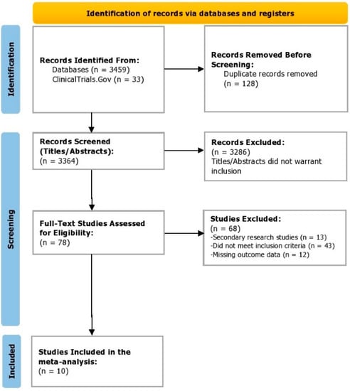 Of the 3492 studies and records identified from the databases and ClinicalTrials.Gov, all of them were screened. Post-screening of the titles and abstracts/summaries, 3286 entries were excluded as they did not fulfill the inclusion criteria, and 78 studies were assessed with full-text scanning for eligibility. On full-text appraisal, 68 studies were removed for multiple reasons, and 10 trials were included in this meta-analysis. The PRISMA flowchart for the study selection process is illustrated in Figure 1. Kappa’s inter-reviewer agreement score was calculated to be 0.91.