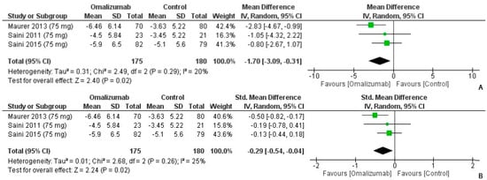 Weekly Itch Score Outcomes with 75 mg dosage of omalizumab [,,]. (A): Mean difference: −1.70 [95% CI: −3.09, −0.31]; Heterogeneity: Tau² = 0.31; Chi² = 2.49, df = 2 (p = 0.29); I² = 20%; Test for overall effect: Z = 2.40 (p = 0.02). (B): Standardized mean difference: −0.29 [95% CI: −0.54, −0.04]; Heterogeneity: Tau² = 0.01; Chi² = 2.68, df = 2 (p = 0.26); I² = 25%; Test for overall effect: Z = 2.24 (p = 0.02).
