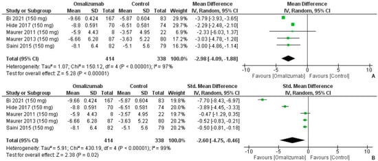 Weekly Itch Score Outcomes with 150 mg dosage of omalizumab [,,,,]. (A): Mean difference: −2.98 [95% CI: −4.09, −1.88]; Heterogeneity: Tau² = 1.07; Chi² = 150.12, df = 4 (p < 0.00001); I² = 97%; Test for overall effect: Z = 5.28 (p < 0.00001). (B): Standardized mean difference: −2.60 [95% CI: −4.75, −0.46]; Heterogeneity: Tau² = 5.91; Chi² = 430.19, df = 4 (p < 0.00001); I² = 99%; Test for overall effect: Z = 2.38 (p = 0.02).