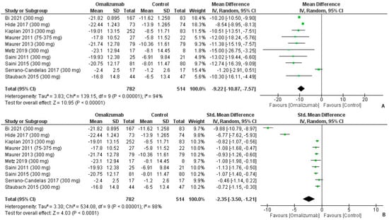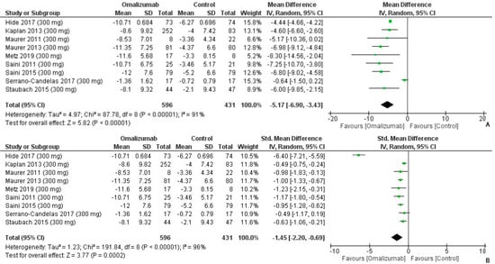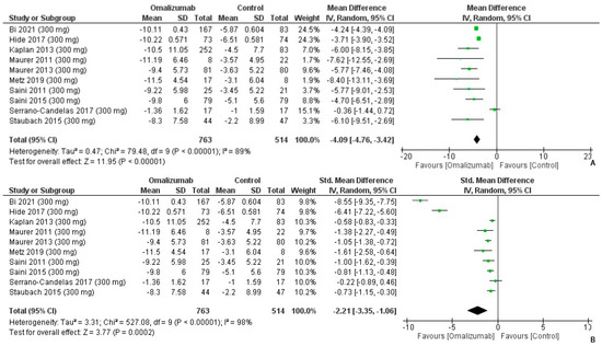 The mean difference for 300 mg intervention of omalizumab was computed as follows: −6.92 (95% CI: −10.38, −3.47, I2 = 94%, p < 0.0001) (Figure 10A). The effect size was the second largest of the three dosages, and Cohen’s d was reported as follows: −2.35 (95% CI: −3.50, −1.21, I2 = 98%, p < 0.0001) (Figure 10B).