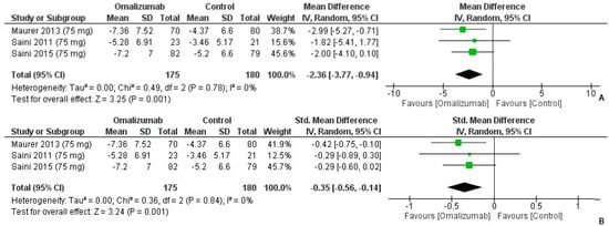 Weekly Wheal Score Outcomes with 75 mg dosage of omalizumab [,,]. (A): Mean difference: −2.36 [95% CI: −3.77, −0.94]; Heterogeneity: Tau² = 0.00; Chi² = 0.49, df = 2 (p = 0.78); I² = 0%; Test for overall effect: Z = 3.25 (p = 0.001). (B): Standardized mean difference: −0.35 [95% CI: −0.56, −0.14]; Heterogeneity: Tau² = 0.00; Chi² = 0.36, df = 2 (p = 0.84); I² = 0%; Test for overall effect: Z = 3.24 (p = 0.001).