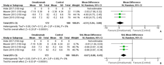 Weekly Wheal Score Outcomes with 150 mg dosage of omalizumab [,,,]. (A): Mean difference: −4.51 [95% CI: −5.94, −3.08]; Heterogeneity: Tau² = 0.00; Chi² = 0.12, df = 2 (p = 0.94); I² = 0%; Test for overall effect: Z = 6.20 (p < 0.00001). (B): Standardized mean difference: −0.67 [95% CI: −0.88, −0.45]; Heterogeneity: Tau² = 0.00; Chi² = 0.11, df = 2 (p = 0.95); I² = 0%; Test for overall effect: Z = 6.03 (p < 0.00001).
