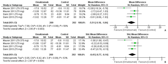 UAS7 outcomes with 75 mg dosage of omalizumab [,,,]. (A): Mean difference: −5.51 [95% CI: −9.18, −1.84]; Heterogeneity: Tau² = 7.66; Chi² = 6.84, df = 3 (p = 0.08); I² = 56%; Test for overall effect: Z = 2.95 (p = 0.003). (B): Standardized mean difference: −0.45 [95% CI: −0.77, −0.14]; Heterogeneity: Tau² = 0.05; Chi² = 6.42, df = 3 (p = 0.09); I² = 53%; Test for overall effect: Z = 2.87 (p = 0.004).
