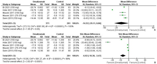 UAS7 outcomes with 150 mg dosage of omalizumab [,,,,]. (A): Mean difference: −14.52 [95% CI: −29.11, 0.06]; Heterogeneity: Tau² = 272.15; Chi² = 8081.80, df = 4 (p < 0.00001); I² = 100%; Test for overall effect: Z = 1.95 (p = 0.05). (B): Standardized mean difference: −6.92 [95% CI: −10.38, −3.47]; Heterogeneity: Tau² = 15.05; Chi² = 591.27, df = 4 (p < 0.00001); I² = 99%; Test for overall effect: Z = 3.93 (p < 0.0001).