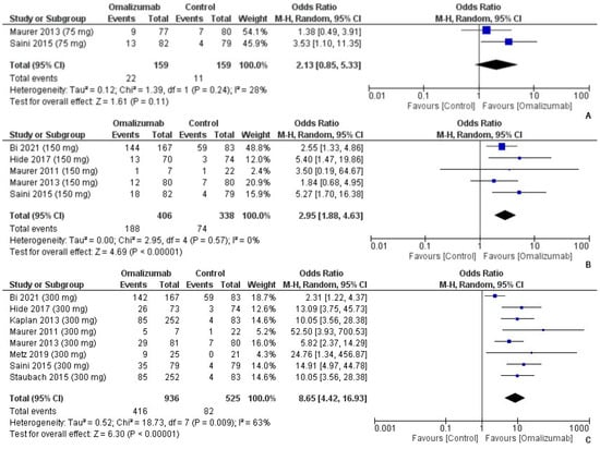 Responders to treatment with 75 mg, 150 mg, and 300 mg of omalizumab [,,,,,,,]. (A): 75 mg; OR = 2.13 [95% CI: 0.85, 5.33]; Heterogeneity: Tau² = 0.12; Chi² = 1.39, df = 1 (p = 0.24); I² = 28%; Test for overall effect: Z = 1.61 (p = 0.11). (B): 150 mg; OR = 2.95 [95% CI: 1.88, 4.63]; Heterogeneity: Tau² = 0.00; Chi² = 2.95, df = 4 (p = 0.57); I² = 0%; Test for overall effect: Z = 4.69 (p < 0.00001). (C): 300 mg; OR = 8.65 [95% CI: 4.42, 16.93]; Heterogeneity: Tau² = 0.52; Chi² = 18.73, df = 7 (p = 0.009); I² = 63%; Test for overall effect: Z = 6.30 (p < 0.00001).