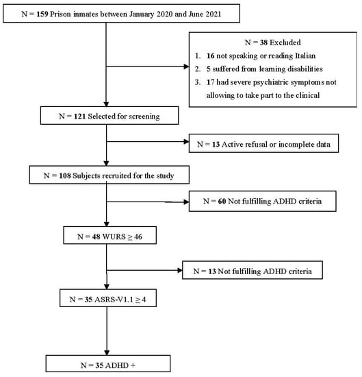 Even though there was increasing sensitivity in the recognition and management of ADHD in the community, few studies focused on this topic with regard to subjects hosted in detention centers. Nevertheless, the relationship between ADHD and other psychiatric comorbidities, substance use disorders, and childhood trauma is still poorly studied in prison populations. With our study, we firstly aimed to investigate the prevalence of ADHD symptoms among a sample of adult male prisoners. Secondly, we aimed to find potential predictors of clinically significant ADHD symptoms for incarcerated male subjects with a specific focus on the different types of coexisting mental disorders (including substance use disorders) and childhood trauma. As discussed above, there is an urgent need to identify adult offenders with ADHD symptoms and to intervene proactively. Indeed, we hypothesized that ADHD is prevalent among prisoners and that subjects with ADHD symptoms have more comorbid mental disorders and substance misuse compared to the ones without ADHD symptoms. Moreover, we expected that one or more types of childhood trauma might better discriminate between the ADHD and non-ADHD groups, thus increasing knowledge regarding this condition. These aspects are of current interest because prisoners with ADHD symptoms are frequently undiagnosed, and they may be treated for a comorbid psychiatric condition instead of their underlying ADHD [,,].