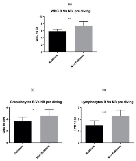 We found a higher number of WBC (GRAN and LYM) in NB, both in pre and post diving value, as compared to B that could explain a different predisposition to bubble formation. Even if the role of anti-inflammatory mediators were not directly investigated in this protocol, these data may be explained considering that SCUBA-related acute inflammation is modulated by circulating WBC. No interesting differences were found concerning RBC and PLT between B and NB. Further experiments will be necessary to understand better our results, raising the number of female divers and investigating the circulating cytokines. If confirmed in future similar protocols with a larger number of subjects, our result may represent a real support for the SCUBA diving community allowing a prediction of the subjects with the higher possibility to develop bubbles in bloodstream after SCUBA diving.