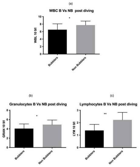 These data were also confirmed in the post diving blood sample analysis (Figure 2) for both GRAN and LYM (GRAN p = 0.02, LYM p = 0.001 respectively) (Table 2).