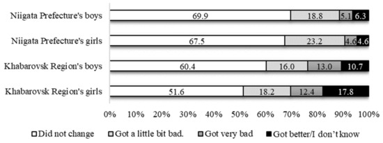 Table 3 shows the self-reported health status of the subjects for the previous six months. Both boys and girls in Khabarovsk had a significantly higher percentage of nervousness than those in Niigata. In addition, Khabarovsk girls had significant difficulty falling asleep (p < 0.001). The results of the self-assessment of health status are shown in Figure 1. In this case, the Khabarovsk girls had the highest percentage of worsening (30.7%), followed by the Khabarovsk boys (29.0%), the Niigata girls (27.8%), and the Niigata boys (23.9%). Overall, 39.1% of the Niigata girls stated that although they were eventually successful, they had difficulty adapting to the new lifestyle, compared to only 21.3% of the Khabarovsk boys and girls.