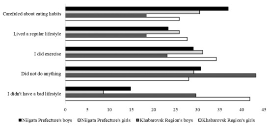 In this study, the factor that worsened the self-assessment of health status of the boys in both Niigata and Khabarovsk was the difficulty of adapting to a new lifestyle. Magson et al. reported that adolescents are more concerned about the government restrictions designed to contain the spread of the virus, compared to the virus itself. Additionally, they found that these concerns were associated with increased anxiety and depressive symptoms, and decreased life satisfaction [15]. Although Khabarovsk’s adolescents had a worse self-assessment of health status, about half of the Khabarovsk boys stated that they did nothing to maintain their health (see Figure 2). In this regard, it may be possible to prevent the deterioration of the self-assessment of health status by focusing on better eating habits, as in Niigata’s adolescents.