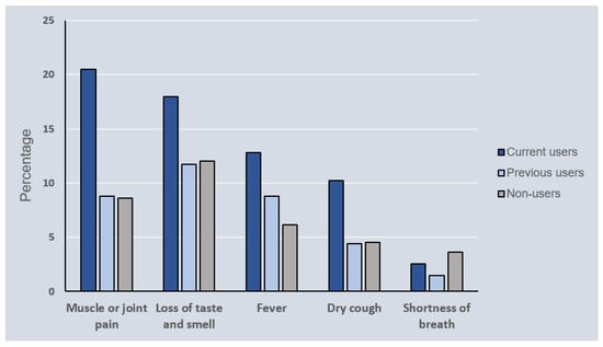 Figure 1 shows the most common self-reported COVID-19 symptoms stratified by the use of AASs. All COVID-19 symptoms, with the exception of shortness of breath, were reported more frequently by current users than past or never users. The most prevalent symptom described by current users was muscular or joint discomfort, accounting for approximately 21% of the current users. In comparison, less than 10% of past users and non-users reported muscular or joint discomfort.