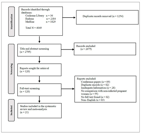 Observational studies (cohort and case–control) investigating the perinatal outcomes in COVID-19 infected pregnant women and published as peer-reviewed articles in English were eligible for inclusion. Case reports, case series, editorials, letters to the editor, perspectives, conference papers, narrative or systematic reviews, and studies without a non-infected pregnant group as the comparator were excluded. We searched Medline, EMBASE, and Cochrane Library databases to identify the published studies from December 2019 to 30 June 2021. The search strategy included a combination of keywords for COVID-19 and perinatal outcomes (Table S1).