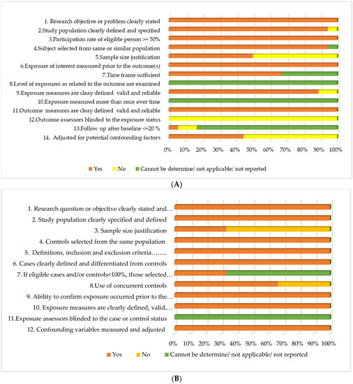 Regarding the quality of the included cohort studies, 10 criteria out of 14 (71%) were satisfied by 40% of the included studies. Almost all of the studies had clearly stated research objectives, clearly defined study populations, clearly defined valid and reliable outcomes, and over ≥50% participation rate by eligible persons. In almost all the included studies, the quality assessment was unable to determine the level of exposures related to examined outcomes, exposure measures more than once over time, and follow-up after baseline. Blinding of the assessors to the exposure status was a serious concern for all the included studies. Only 40–55% of the included cohort studies were marked positively for the criteria of adjusting for potential confounding factors and having a justified sample size. With regards to the quality of included case–control studies, eight criteria out of 12 (75%) were satisfied by 60% of the included studies. All the studies satisfied the criteria related to clearly defined objective/s, clearly defined study population, selection of the control from the same population, consistent use of defined inclusion and exclusion criteria, clearly defined and differentiated case and control groups, ability to confirm the exposure occurred prior to the development of the condition, implementation of valid and reliable exposure measures, and measuring and adjusting for confounding variables. Blinding of the assessors to the exposure status was not determinable in all the studies. Less than 35% of the included case–control studies had a justified sample size (Figure 2A,B). Individual study assessments were attached as a supplementary file (Table S2).