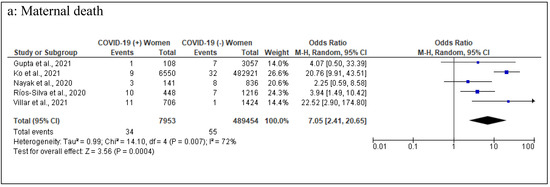 The reported maternal outcomes included maternal deaths, miscarriages/abortions, preeclampsia, PROMs/PPROMs, cesarean deliveries, and operative vaginal births. Out of these outcomes, maternal deaths, preeclampsia and cesarean deliveries were found to be statistically significant. In terms of studies on maternal deaths, two studies [24,33] reported an increased risk with COVID-19 during pregnancy. Ten studies [14,17,19,21,22,24,27,30,33,34] reported data on maternal death, and five of them were excluded [14,17,19,22,34] from the meta-analysis because no maternal death was reported in one or both arms. Meta-analysis of the remaining five studies (7953 COVID-19 infected versus 489,454 COVID-19 non-infected) revealed a significant increase in maternal death among COVID-19 infected pregnant women (pooled OR 7.05 [95% CI 2.41−20.65]; p < 0.05; I2 = 72 %). Based on 16 studies (10,050 COVID-19 infected pregnancies and 497,036 COVID-19 non-infected pregnancies) [14,15,16,17,18,19,21,22,24,26,29,31,32,33,34], a significant increase in preeclampsia during pregnancy was identified among women in the infected pregnant cohort compared to the non-infected comparator (pooled OR 1.39 [95% CI 1.29−1.50]; p < 0.05; I2 = 25 %). Out of 21 included studies, 20 studies (12,982 COVID-19 infected pregnancies and 583,619 COVID-19 non-infected pregnancies) [14,15,16,17,18,19,20,21,22,23,24,25,26,27,28,29,31,32,33,34] provided data on cesarean section and found a statistically significant increase in cesarean section deliveries among infected women (pooled OR 1.67 [95% CI 1.29−2.15]; p < 0.05; I2 = 95%). Only two studies provided data on termination of pregnancy [14,22], but no meta-analysis was carried out as there was no termination of pregnancies in the non-infected cohort of one of the studies [14]. Four studies reported miscarriages/abortions [15,18,27,34], and no statistically significant difference of miscarriages/abortions was found between COVID-19 infected and non–infected pregnant women (pooled OR 1.56 [95% CI 0.59−4.12]; p = 0.37; I2 = 68 %). Pooled odds of 1358 COVID-19 infected pregnancies and 4045 non-infected pregnancies [14,17,19,26,31,32,33] revealed no statistically significant difference of PROM/PPROM between COVID-19 infected and non-infected pregnancies (pooled OR 1.25 [95% CI 0.85−1.84]; p = 0.25; I2 = 65%) (Figure 4A).