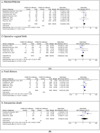 The reported fetal outcomes included intrauterine death and fetal distress. Out of these, fetal distress was found to be statistically significant. Based on the data from 1248 newborns born to COVID-19 infected pregnant women and 7422 newborns born to COVID-19 non-infected pregnant women [14,18,21,31,33], a statistically significant increase in fetal distress was observed among the newborns of the COVID-19 infected women compared to the COVID-19 non-infected (pooled OR 1.66 [95% CI 1.35−2.05]; p < 0.05; I2 = 26%). Four studies [16,17,22,27] reported data on intrauterine death, and of them, one study [16] was excluded from the meta-analysis as no adverse events were reported in infected and non-infected cohorts. The meta-analysis of the remaining three studies (348 COVID-19 infected pregnancies and 1376 COVID-19 non-infected pregnancies) found no statistically meaningful change in intrauterine deaths related to COVID-19 infection during pregnancy (pooled OR 1.79 [95% CI 0.51−6.23]; p = 0.36; I2 = 68%) (Figure 4B).