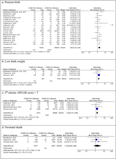 Overall findings of our study were, (1) the reported incidence rates of COVID-19 infection among pregnant women ranged from 1.3% to 27%, disregarding the fact that the results were based on single-center studies to multinational studies; (2) with regards to the adverse maternal outcomes, we found that there was a statistically significant increase in maternal deaths, preeclampsia, and cesarean deliveries, while miscarriages/abortions, PROMs/PPROMs, and operative vaginal births were non-significant in COVID-19 infected pregnant women compared to non-infected; (3) with regards to the adverse fetal outcomes, fetal distress was found to be statistically significant, while intrauterine death was non-significant in COVID-19 infected pregnancies; and (4) with regards to the adverse neonatal outcomes, all reported fetal outcomes except neonatal death, including preterm birth, low birth weight, stillbirth, fifth minute Apgar score < 7, and admissions to NICU showed significant differences in births to COVID-19 infected women compared to non-infected.