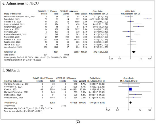 The reported neonatal outcomes included preterm birth, low birth weight, stillbirth, fifth minute Apgar score < 7, admissions to NICU, and neonatal death. All of these outcomes were found to be statistically significant, except neonatal death. Pooled preterm birth [14,15,16,17,18,19,20,21,22,23,24,25,26,29,31,32,33,34] of 10,555 births to COVID-19 infected women compared to 498,064 COVID-19 non-infected in 18 studies (pooled OR 1.86 [95% CI 1.34−2.58]; p < 0.05; I2 = 90%); pooled low birth weight [14,32,33] of 807 births to COVID-19 infected women compared to 1743 to COVID-19 non-infected women in three studies (pooled OR 1.69 [95% CI 1.35−2.11]; p < 0.05; I2 = 0%); pooled fifth minute APGAR score of less than 7 [21,22,26,28] for 2777 births to COVID-19 infected women compared to 88,909 COVID-19 non-infected in four studies (pooled OR 1.44 [95% CI 1.11−1.86]; p < 0.05; I2 = 0%) and pooled admissions to NICU [14,16,18,19,20,21,22,26,27,28,29,32,34] of 4804 COVID-19 births to infected women compared to 93,887 COVID-19 non-infected in 13 studies (pooled OR 2.12 [95% CI 1.36−3.32]; p < 0.05; I2 = 89%) were observed to be significantly higher. Nine studies [15,17,18,19,24,25,26,31,34] reported data on stillbirths, but only six studies (8392 in COVID-19 infected pregnancies compared to 487,395 in COVID-19 non-infected) were included in the meta-analysis due to no stillbirths in COVID-19 infected cohorts in two studies [15,25] and no stillbirths in the COVID-19 non-infected cohort in one study [19]. The pooled odds of six included studies revealed a statistically significant increase in stillbirths among COVID-19 infected women compared to that among the COVID-19 non-infected (pooled OR 1.46 [95% CI 1.16−1.85]; p = 0.05; I2 = 17%). Of the included studies, neonatal deaths were assessed in seven studies [14,16,21,22,26,31,34], but only three studies were eligible for the meta-analysis [16,21,34]. The pooled odds ratio of three studies (1317 births to COVID-19 infected mothers and 3873 births to COVID-19 non-infected) revealed no significant difference in neonatal deaths between COVID-19 infected and non-infected cohorts (pooled OR 1.73 [95% CI 0.60−5.00]; p = 0.31; I2 = 0%) (Figure 4C).