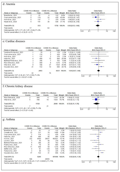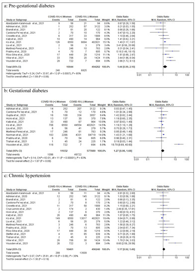 A higher but non-significant increase in pre-gestational diabetes was observed in infected women compared to non-infected women (pooled OR 1.44 [95% CI 0.99−2.10]; p = 0.06; I2 = 65%). Gestational diabetes [15,17,21,22,23,24,25,26,28,29,32,34] (11032 COVID-19 infected pregnancies and 577,889 COVID-19 non-infected in 12 studies; pooled OR 1.27 [95% CI 0.96−1.68]; p = 0.09; I2 = 83%) was also high among COVID-19 infected women compared to COVID-19 non-infected; however, the difference still was not significant. Pooled odds of 10,461 COVID-19 infected pregnancies and 496,246 COVID-19 non-infected in 17 studies revealed no statistically significant difference in chronic hypertension [14,15,16,17,18,19,22,23,24,25,26,29,30,31,32,33,34] (pooled OR 1.17 [95% CI 0.92−1.49]; p = 0.19; I2 = 38%) between COVID-19 infected and non-infected pregnant women. Data on asthma were reported by 14 studies, but only 12 studies [16,18,19,23,24,25,26,29,30,31,32,34] were included in the meta-analysis (9240 COVID-19 infected pregnancies and 491,066 COVID-19 non-infected pregnancies) as there were no events reported either in infected or non-infected women in two studies [17,22]. The pooled odds ratio of the 12 included studies revealed no risk of being infected with COVID-19 due to asthma during pregnancy (pooled OR 0.92 [95% CI 0.65−1.30]; p = 0.64; I2 = 75%). Similarly, no statistically significant differences between COVID-19 infected and non-infected pregnancies were observed with relevance to anemia [16,19,22,27] (513 COVID-19 infected pregnancies versus 1758 COVID-19 non-infected pregnancies; four studies; pooled OR 0.92 [95% CI 0.53−1.60]; p = 0.77; I2 = 0%), cardiac diseases [17,19,22,23,26,30,33,34] (2993 COVID-19 infected pregnancies versus 6031 COVID-19 non-infected; eight studies; pooled OR 1.00 [95% CI 0.67−1.48]; p = 0.98; I2 = 0%), chronic kidney disease [30,33] (1154 COVID-19 infected pregnancies versus 2640 COVID-19 non-infected; two studies; pooled OR 0.72 [95% CI 0.31−1.70]; p = 0.45; I2 = 0%), chronic lung diseases other than asthma [19,24,26,30,33] (8124 infected pregnancies versus 486,754 COVID-19 non-infected; five studies; pooled OR 1.33 [95% CI 0.95−1.87]; p = 0.10; I2 = 0%), hypothyroidism [14,17,27] (267 COVID-19 infected pregnancies versus 1100 COVID-19 non-infected; three studies; pooled OR 0.93 [95% CI 0.42−2.04]; p = 0.85; I2 = 44%), immunosuppression [16,30] (509 COVID-19 infected pregnancies versus 1338 COVID-19 non-infected; two studies; pooled OR 1.20 [95% CI 0.29−4.90]; p = 0.80; I2 = 37%) and thrombophilia [19,26] (420 COVID-19 infected pregnancies versus 1193 COVID-19 non-infected; two studies; pooled OR 0.75 [95% CI 0.28−2.03]; p = 0.57; I2 = 0%) (Figure 5).