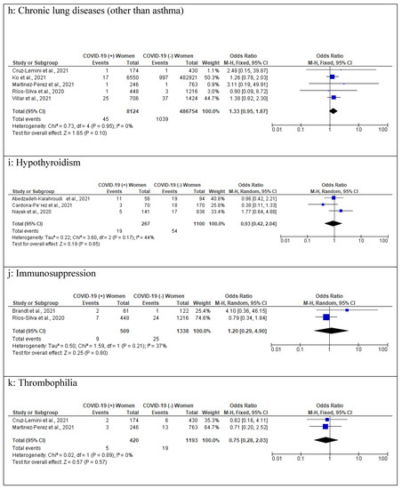 Forest plots of comorbidities among COVID-19 infected women. (a) Pre-gestational diabetes. (b) Gestational diabetes. (c) Chronic hypertension. (d) Anemia. (e) Cardiac diseases. (f) Chronic kidney disease. (g) Asthma. (h) Chronic lung diseases (other than asthma). (i) Hypothyroidism. (j) Immunosuppression. (k) Thrombophilia.