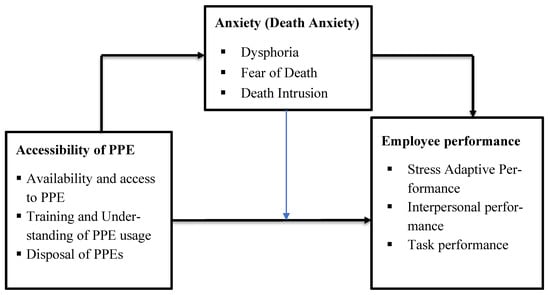 According to the process efficiency theory, anxiety “pre-empts some of the processing and storage resources of the working memory system” that hampers performance []. Anxiety, avoidance motivation, and the arousal theory postulate that anxiety (worry) is “equated with avoidance motivation, which produces a subsequent decrease in resources allocated to the task (on-task effort)” []. On worry and the attentional interference theory, Liebert and Morris [] established that anxiety comprises worry and emotionality, and opined that anxiety (worry) is an important factor that decreases the employee’s performance. On worker behaviour, the terror-management theory (TMT) framework can be attributable to both the psychological and emotional responses exhibited by workers towards the outbreak of the coronavirus. Thus, the TMT posits that the fear of death is a major driver of human behaviour []. By incorporating these theories into the study, it can be assumed that access to PPEs, which remain a significant barrier between humans and the virus in such an exposed work environment may cause a high level of anxiety (fear and worry) and consequently influence employees’ work behaviour.