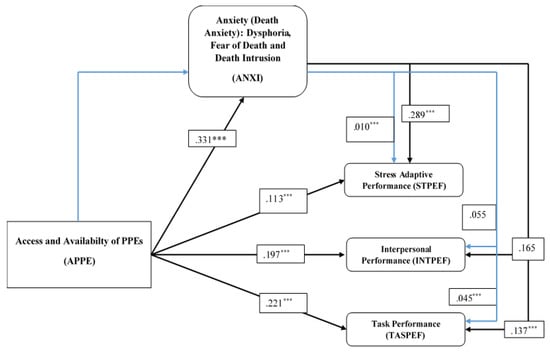 Again, the association between anxiety and access, availability, and use of PPEs (APPEs) as estimated by the path analysis was also found to be significant. As indicated by Duan and Zhu []; Gallagher et al. []; Wang et al. []; and Xiao [], the emergence of COVID-19 has significantly caused mental health problems among people, and the rise in anxiety has been named as a major concern; however, the access and availability of PPEs have proven effective in mitigating or controlling the risk of anxiety, as it is found to lessen worry and fear among people []. The study of Pérez-Mengual et al. [], for instance, reported that women displayed higher scores on anxiety and fear of personal death, while in men, the fear of personal death mediated the relationship between neuroticism and anxiety. In the context of this study, where anxiety is defined in the confines of death anxiety, it is right to assume that the inevitability and unpredictable nature of death makes people feel a sense of horror, and this fear of death is a fundamental source of anxiety, hence its significant association with APPE []. The mismanagement of this kind of anxiety in this period where different waves of the COVID-19 pandemic are emerging may consequently aggravate symptoms of mental disorders [,]; hence, workers can only feel safe, emotionally stable, and experience a low level of anxiety if they have easy and adequate access to all needed PPEs for their work. Most studies have found a strong and consistent relationship between access to PPEs and risk of COVID-19 exposure across multiple countries [,,], while other studies have also supported the importance of PPE in reducing worry and fear related to the transmission of COVID-19 [,].