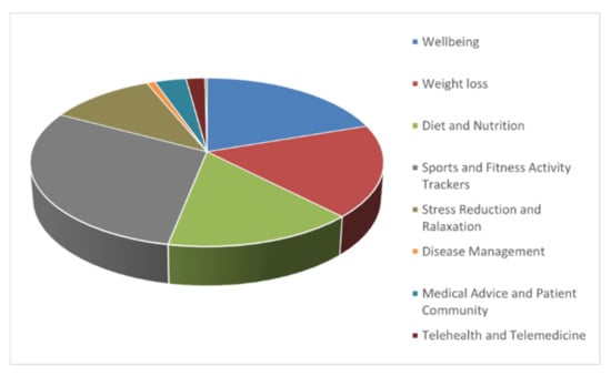 Based on the responses, we considered the most popular mHealth app categories in the mainstream (Apple and Google Play stores), as illustrated in Figure 1. We observed that sports and fitness activity tracking (29.7%), wellbeing (19.8%), and weight loss (17.8%) were the three most popular downloaded app categories. Similarly, regarding features based on a classification of behaviour-change techniques [19,25,26], respondents indicated maintaining or improving physical fitness (34.4%) as the most critical feature. In addition, respondents also revealed maintaining or losing weight (24.9%) and positively changing or improving lifestyle (22%) to be significant features.