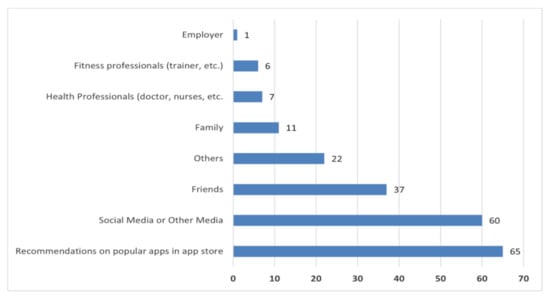 In the context of mHealth adoption, we explored positive drivers of mHealth app download. We discover that respondents most often discover health apps based on popular recommendations in the app store (Figure 2). However, only a few respondents indicated learning about health apps from their employers or medical professionals. Surprisingly, it is expected that health experts significantly influence recommendations of health apps. Generally, individuals interested in using health apps are expected to seek the advice of medical experts concerning which particular health app to adopt. Such recommendations from medical professionals are usually based on knowledge and experience [28]. However, consistent with previous findings [19], health experts have limited influence on mHealth app recommendations. Moreover, respondents’ positive drivers for engaging with fitness apps include sustaining or improving physical fitness levels, maintaining or losing weight, and improving quality of life.