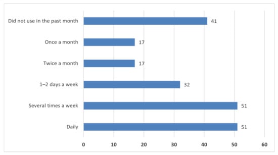It is crucial to establish critical factors that promote long-term engagement with mHealth apps. In this context, participants’ primary reasons for engagement were maintaining or improving physical fitness levels (34.4%), losing/managing weight (24.9%), and improving quality of life (22%). Focusing on motivational affordances, we found that respondents are mainly encouraged to use mHealth apps through social media (16.3%) and friends (15.3%). In any case, it should be noted that several users explicitly acknowledged not receiving any encouragement (49.3%). Regarding the frequency of mHealth use, 48.8% of users engage with health apps daily or several times a week (Figure 3). A considerable number of users engaged with an mHealth apps in the past month (19.6%).
