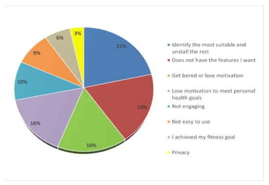 Despite the effectiveness of health and fitness apps, a significant challenge is lack of sustained use. A recent study shows that user commitment to mHealth is low, with about 53% uninstalled within 30 days of download [29]. Figure 4 shows participants’ main reasons for app abandonment. In line with other studies [30,31], the results show that lack of interest or declining motivation (31.6%) is one of the critical factors for the abandonment of mHealth apps. Furthermore, participants highlighted frequently downloading apps before selecting the most acceptable and uninstalling the rest (21.5%). Moreover, lack of desired features in the app (18.7%), the app not being fun (10%), and not being easy to use (8.6%) were also identified as reasons for discontinued use of mHealth apps.