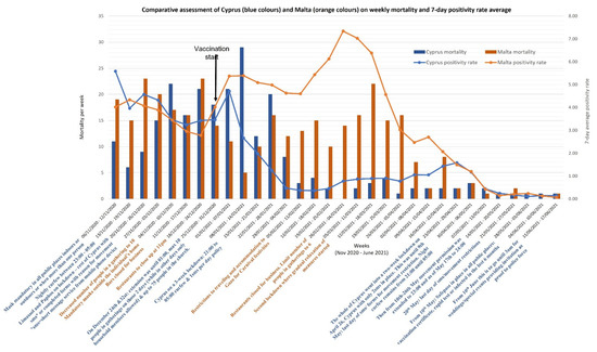 In Cyprus, 8349 per 100,000 positive cases werebeen reported up until 17 June 2021; in Malta, the number of positive cases reported was 6197 per 100,000. The mortality was 35 per 100,000 for Cyprus and 71 per 100,000 for Malta, as shown in Figure 1. Figure 1 compares the 7-day moving average for mortality and positivity rate from 6 November 2021 to 17 June 2021 for Cyprus (blue colors) and Malta (orange colors), along with the associated restrictions introduced to mitigate the spread. The positivity rate and mortality between December and June significantly differed between the two countries (average positivity rate Cyprus 1.34, Malta 3.37 p ≤ 0.01; average mortality Cyprus 7.29, Malta 9.68 p ≤ 0.01). Both the positivity rate and mortality for Cyprus declined due to strict public health measures and vaccination roll-out in early January (positivity rate by 95% and mortality by 58%). In contrast, for Malta, there was a sharp increase in positivity rate (64% p ≤ 0.01) amidst the vaccination roll-out, as almost no public health restrictions were in place during the Christmas and Carnival period until March, when a lockdown was re-introduced. A distinctive difference in positivity rate (14 per 100,000 population; p ≤ 0.01) can also be observed between January to mid-April 2021 between Cyprus and Malta. However, from April onwards it is evident that the positivity rate and mortality decline (positivity rate Cyprus by 82%, Malta by 95%; mortality Cyprus by 90%, Malta by 95%, p ≤ 0.01, respectively) in both countries as the vaccination roll-outs progressively covered about 58.93% of the Maltese population, while Cyprus had fully inoculated about 38.03% of its population.