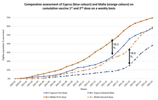 We sought to investigate the extent to which the COVID-19 vaccination strategies, inoculation rate, and COVID-19 outcome differ between the Cyprus and Malta. The aim of this research work was to do a comparison between public health actions and outcomes, as outlined above, to map any significant differences based on these results and potentially inform future public health planning of these, or similar small-size, countries. A comprehensive summary of the vaccination operations and strategy was provided by the ‘COVID-19 Vaccination Logistics’ officer of Malta and the Ministry of Health of Cyprus [10]. Data on COVID-19 infection cases and vaccination were obtained from Ministry of Health websites and COVID-19 dashboards of the two respective Island states in Europe [11,12]. Local published studies, press releases, and newspaper articles were also considered. Vaccination data were obtained from the European Centre for Disease Prevention and Control (ECDC) up until the week 23 of the year 2021 [13].