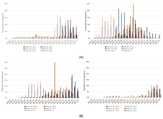 (A) Comparative assessment of the weekly first dose vaccination coverage by age groups in Cyprus and Malta. (B) Comparative assessment of the weekly full vaccination coverage by age groups in Cyprus and Malta.