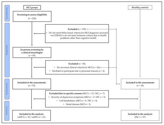 Flow diagram that schematically depicts the selection processes (from screening to assess eligibility to the final inclusion in the statistical analysis) and the reasons for exclusion. aMCI: amnestic mild cognitive impairment; CERAD: Alzheimer’s Disease Consortium to Establish a Registry test battery; HC: healthy controls; naMCI: non-amnestic mild cognitive impairment.