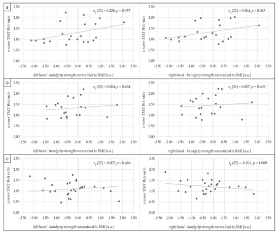 Scatter plots displaying the correlations between normalized handgrip strength (nHGS) of the left hand and right hand and z-scores of TMT B/A ratio (reflecting executive functioning) in the older individuals with amnestic mild cognitive impairment (aMCI) in (a), for older adults with non-amnestic mild cognitive impairment (naMCI) in (b) and healthy older controls (HC) in (c). The handgrip strength was normalized to the Body Mass Index to account for the influence of anthropometrics on handgrip strength [58,59]. a.u.: arbitrary unit; BMI: Body Mass Index; rp: partial correlation coefficient (accounting for age, sex, and severity of depressive symptoms [via scores in Geriatric Depression Scale]); TMT: Trail Making Test.