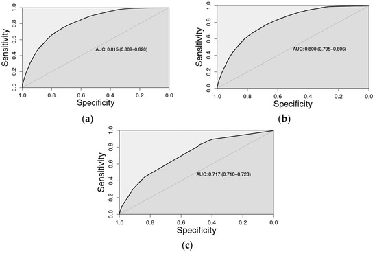 Figure 1 represents the area under the (receiver operating characteristic (ROC)) curve (AUC) for the three aforementioned multivariate logistic regression models. Their respective values were: (a) 0.815 (95% CI: 0.809–0.820); (b) 0.800 (95% CI: 0.795–0.806); and (c) 0.717 (95% CI: 0.710–0.723). Competing resources, represented by only seven binary covariates, offered both stand-alone (AUC = 0.717) and marginal explanatory value, as demonstrated through DeLong’s test for AUC differences between the model with patient characteristics and competing resources and the model with only patient characteristics (AUC difference = 0.015; 95% CI: 0.012–0.016; p < 0.0001). Table S2 presents the logistic regression analysis results with coefficient estimates, standard errors, and p-values for all three models. This highlights that both patient-level and competing resource information can be relevant to explain variability in response resource utilization.
