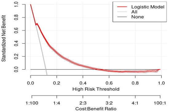 Misutilization by patient visit is not observable in most cases without clinical information and guidelines. In order to identify over-/under-utilization without a clinical guideline, a decision curve analysis was performed using commonly available administrative information from model (a) above. This decision curve was fitted and compared to competing model-free approaches of treat all (resource is expected to be used in all patient visits) and treat none (resource is not expected to be used in any patient visit) alternatives. A decision threshold with a positive net benefit was informed by the industry-average standards of resource utilization, so that the results were not affected by thresholds that implied increases or decreases in utilization. Misutilization is, therefore, estimated against industry standards of utilization.