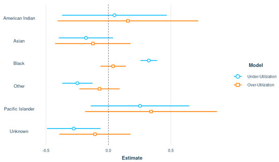 Forest plot showing the logistic regression coefficient estimates representing the associations between race and under- and over-utilization, with White patients representing the reference category.