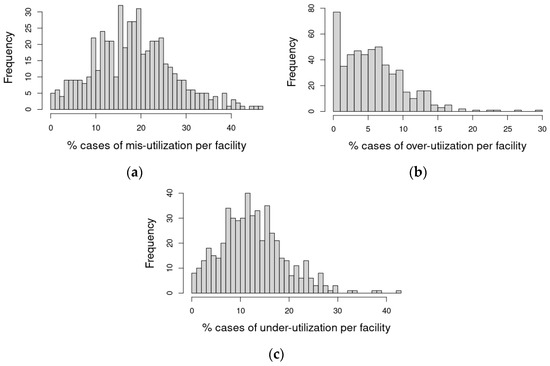 Histograms portraying the observed distribution of (a) mis-, (b) over-, and (c) under-utilization rates by facility using the multivariate logistic model (containing both patient and competing resources information) fitted probabilities and a probability threshold for utilization of 20%.