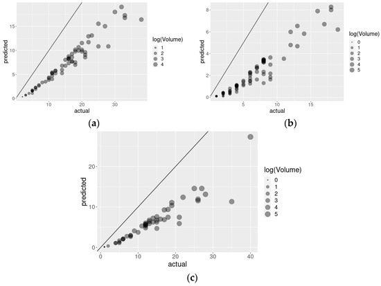 Bubble plots where predicted (a) mis-, (b) over-, and (c) under-utilization counts (y-axis) are plotted against the actual values (x-axis) from the Poisson rate regression models where each bubble represents the facilities for which the p-values are below 0.01 and with the size of each bubble representing the log volume of patients in the facility.