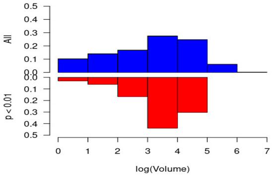 Distribution of cohort patient volume (log scale) for all hospitals (top, blue) versus those with substantial levels of misutilization, identified as p < 0.01 (bottom, red).