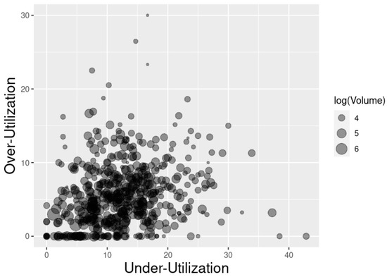 Figure 7 portrays under- and over-utilization by facility, with the bubble size representing facility (log)volume. Simple (independent) linear regressions to assess the associations of log(volume) with over- and under-utilization show strong negative associations (regression coefficients of −2.00 and −1.49, respectively, and p < 0.0001 for both regressions).