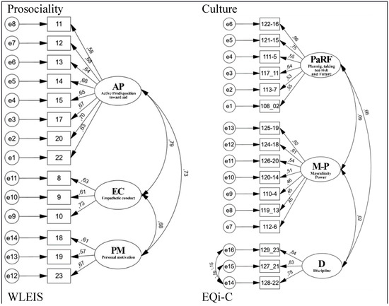 To validate the predictive variables of prosociality according to the described scales, the analysis of 4 confirmatory models was carried out using CFA. For each scale, a structural equation model (SEM) was constructed, formed as follows. In the case of the prosociality scale, it was composed of the following latent variables: AP with 8 observed variables, empathetic conduct (EC) with 3 observed variables, and personal motivation (PM) with 3 observed variables (Figure 1). For the culture scale it included the latent variables PaRF with 6 observed variables, masculinity power (M-P) with 7 observed variables, and discipline (D) with 3. The SEM for the EQi-C scale included the latent variables AE with 7 observed variables, interpersonal (I) with 5 observed variables, and coping/adaptation/adaptability (CAA) with 4 observed variables. Finally, that for the WLEIS scale included all 4 of its latent variables emotional regulation (ER), intrapersonal emotional intelligence (iEI), interpersonal emotional intelligence (IEI), and self-motivation (A), with 4 observed variables each.