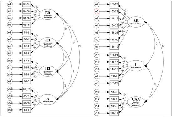 The instrument was subjected to various preliminary statistical analyses. The internal consistency [57,58] was analyzed using Cronbach’s alpha statistic (α = 0.878) to estimate dependence, independence, and reliability indicators for the 83 items. The adequacy of the correlation matrix was verified in order to see its possible factorization under the multivariate technique of the Kaiser–Mayer–Olkin (KMO) criterion, along with Bartlett’s sphericity test, the maximum likelihood extraction method, and promax rotation analysis. A combination of exploratory factor analysis (EFA) and confirmatory factor analysis (CFA) was deployed. In the case of the EFA, following Hair et al. (1999) [59] and Pérez et al. (2013) [60], we proceeded to eliminate those variables with low extractions, with the aim of improving the KMO, and then applied EFA once again to the remaining variables. This made it possible to eliminate variables 9 and 14 of the prosociality scale; 1, 3, 8, 9, 10, 12, and 17 of the culture scale; and 5, 7, 8, 9,12, 13, 14, 15, 16, 20, 24, and 27 of the EQi-C scale, on account of their coefficients being less than 0.400 in each case. The entire instrument with the 62 items of the 4 scales together obtained a good reliability (α = 0.878).