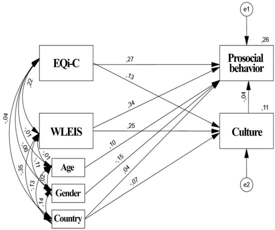 Path model of the hypothesized relationships between the dependent variable prosociality and EQi-C, WLEIS, and culture, with control variables, such as age, sex, and country.