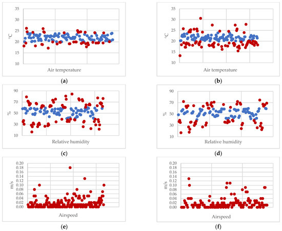 Distribution of the values of air temperature (a,b), relative humidity (c,d), and airspeed (e,f) at rest (a,c,e) and in operation (b,d,f) in comparison with the reference values. Blue dot = compliant values; Red dot = non-compliant values.